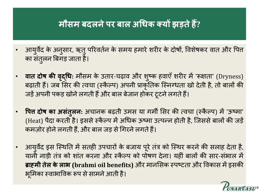 मौसमबदलनेपरबालअधिकक्योंझड़तेहैं?मौसमबदलनेपरबालअधिकक्योंझड़तेहैं? • आयुर्वेदकेअनुसार, ऋतुपरिवर्तनकेसमयहमारेशरीरकेदोषों, विशेषकरवातऔरपित्तकासंतुलनबिगड़जाताहै। • वातदोषकीवृद्धि:मौसमकेउतार-चढ़ावऔरशुष्कहवाएँशरीरमें 'रूक्षता' (Dryness) बढ़ातीहैं।जबसिरकीत्वचा (स्कैल्प) अपनीप्राकृतिकस्निग्धताखोदेतीहै, तोबालोंकीजड़ेंअपनीपकड़खोनेलगतीहैंऔरबालबेजानहोकरटूटनेलगतेहैं। • पित्तदोषकाअसंतुलन:अचानकबढ़तीउमसयागर्मीसिरकीत्वचा (स्कैल्प) में 'ऊष्मा' (Heat) पैदाकरतीहै।इससेस्कैल्पमेंअधिकऊष्माउत्पन्नहोतीहै, जिससेबालोंकीजड़ेंकमज़ोरहोनेलगतीहैं, औरबालजड़सेगिरनेलगतेहैं। • आयुर्वेदइसस्थितिमेंसतहीउपचारोंकेबजायपूरेतंत्रकोस्थिरकरनेकीसलाहदेताहै, यानीनाड़ीतंत्रकोशांतकरनाऔरस्कैल्पकोपोषणदेना।यहींबालोंकीसार-संभालमेंब्राह्मीतेलकेलाभ(brahmi oil benefits)औरमानसिकस्पष्टताऔरविकासमेंइसकीभूमिकास्वाभाविकरूपसेसामनेआतीहै।