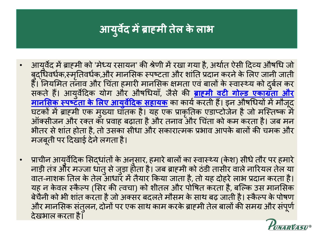 आयुर्वेदमेंब्राह्मीतेलकेलाभआयुर्वेदमेंब्राह्मीतेलकेलाभ • आयुर्वेदमेंब्राह्मीको 'मेध्यरसायन' कीश्रेणीमेंरखागयाहै, अर्थातऐसीदिव्यऔषधिजोबुद्धिवर्धक,स्मृतिवर्धक,औरमानसिकस्पष्टताऔरशांतिप्रदानकरनेकेलिएजानीजातीहै।नियमिततनावऔरचिंताहमारीमानसिकक्षमताएवंबालोंकेस्वास्थ्यकोदुर्बलकरसकतेहैं।आयुर्वेदिकयोगऔरऔषधियाँ, जैसेकीब्राह्मीवटीगोल्डएकाग्रताऔरमानसिकस्पष्टताकेलिएआयुर्वेदिकसहायककाकार्यकरतीहैं।इनऔषधियोंमेंमौजूदघटकोंमेंब्राह्मीएकमुख्याघातकहै।यहएकप्राकृतिकएडाप्टोजेनहैजोमस्तिष्कमेंऑक्सीजनऔररक्तकाप्रवाहबढ़ाताहैऔरतनावऔरचिंताकोकमकरताहै।जबमनभीतरसेशांतहोताहै, तोउसकासीधाऔरसकारात्मकप्रभावआपकेबालोंकीचमकऔरमजबूतीपरदिखाईदेनेलगताहै। • प्राचीनआयुर्वेदिकसिद्धांतोंकेअनुसार, हमारेबालोंकास्वास्थ्य (केश) सीधेतौरपरहमारेनाड़ीतंत्रऔरमज्जाधातुसेजुड़ाहोताहै।जबब्राह्मीकोठंडीतासीरवालेनारियलतेलयावात-नाशकतिलकेतेलआधारमेंतैयारकियाजाताहै, तोयहदोहरेलाभप्रदानकरताहै।यहनकेवलस्कैल्प (सिरकीत्वचा) कोशीतलऔरपोषितकरताहै, बल्किउसमानसिकबेचैनीकोभीशांतकरताहैजोअक्सरबदलतेमौसमकेसाथबढ़जातीहै।स्कैल्पकेपोषणऔरमानसिकसंतुलन, दोनोंपरएकसाथकामकरकेब्राह्मीतेलबालोंकीसमग्रऔरसंपूर्णदेखभालकरताहै।