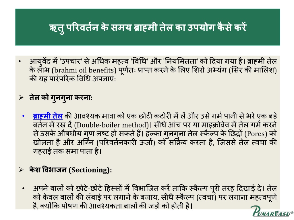 ऋतुपरिवर्तनकेसमयब्राह्मीतेलकाउपयोगकैसेकरेंऋतुपरिवर्तनकेसमयब्राह्मीतेलकाउपयोगकैसेकरें • आयुर्वेदमें 'उपचार' सेअधिकमहत्व 'विधि' और 'नियमितता' कोदियागयाहै।ब्राह्मीतेलकेलाभ (brahmi oil benefits) पूर्णतःप्राप्तकरनेकेलिएशिरोअभ्यंग (सिरकीमालिश) कीयहपारंपरिकविधिअपनाएं: • तेलकोगुनगुनाकरना: • ब्राह्मीतेलकीआवश्यकमात्राकोएकछोटीकटोरीमेंलेंऔरउसेगर्मपानीसेभरेएकबड़ेबर्तनमेंरखदें (Double-boiler method)।सीधेआंचपरयामाइक्रोवेवमेंतेलगर्मकरनेसेउसकेऔषधीयगुणनष्टहोसकतेहैं।हल्कागुनगुनातेलस्कैल्पकेछिद्रों (Pores) कोखोलताहैऔरअग्नि (परिवर्तनकारीऊर्जा) कोसक्रियकरताहै, जिससेतेलत्वचाकीगहराईतकसमापाताहै। • केशविभाजन (Sectioning): • अपनेबालोंकोछोटे-छोटेहिस्सोंमेंविभाजितकरेंताकिस्कैल्पपूरीतरहदिखाईदे।तेलकोकेवलबालोंकीलंबाईपरलगानेकेबजाय, सीधेस्कैल्प (त्वचा) परलगानामहत्वपूर्णहै, क्योंकिपोषणकीआवश्यकताबालोंकीजड़ोंकोहोतीहै।