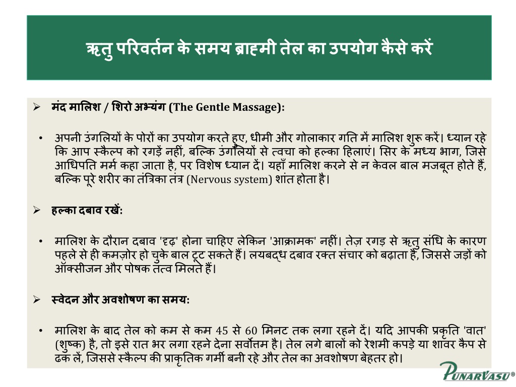 ऋतुपरिवर्तनकेसमयब्राह्मीतेलकाउपयोगकैसेकरेंऋतुपरिवर्तनकेसमयब्राह्मीतेलकाउपयोगकैसेकरें • मंदमालिश / शिरोअभ्यंग (The Gentle Massage): • अपनीउंगलियोंकेपोरोंकाउपयोगकरतेहुए, धीमीऔरगोलाकारगतिमेंमालिशशुरूकरें।ध्यानरहेकिआपस्कैल्पकोरगड़ेंनहीं, बल्किउंगलियोंसेत्वचाकोहल्काहिलाएं।सिरकेमध्यभाग, जिसेआधिपतिमर्मकहाजाताहै, परविशेषध्यानदें।यहाँमालिशकरनेसेनकेवलबालमजबूतहोतेहैं, बल्किपूरेशरीरकातंत्रिकातंत्र (Nervous system) शांतहोताहै। • हल्कादबावरखें: • मालिशकेदौरानदबाव 'दृढ़' होनाचाहिएलेकिन 'आक्रामक' नहीं।तेज़रगड़सेऋतुसंधिकेकारणपहलेसेहीकमज़ोरहोचुकेबालटूटसकतेहैं।लयबद्धदबावरक्तसंचारकोबढ़ाताहै, जिससेजड़ोंकोऑक्सीजनऔरपोषकतत्वमिलतेहैं। • स्वेदनऔरअवशोषणकासमय: • मालिशकेबादतेलकोकमसेकम 45 से 60 मिनटतकलगारहनेदें।यदिआपकीप्रकृति 'वात' (शुष्क) है, तोइसेरातभरलगारहनेदेनासर्वोत्तमहै।तेललगेबालोंकोरेशमीकपड़ेयाशावरकैपसेढकलें, जिससेस्कैल्पकीप्राकृतिकगर्मीबनीरहेऔरतेलकाअवशोषणबेहतरहो।