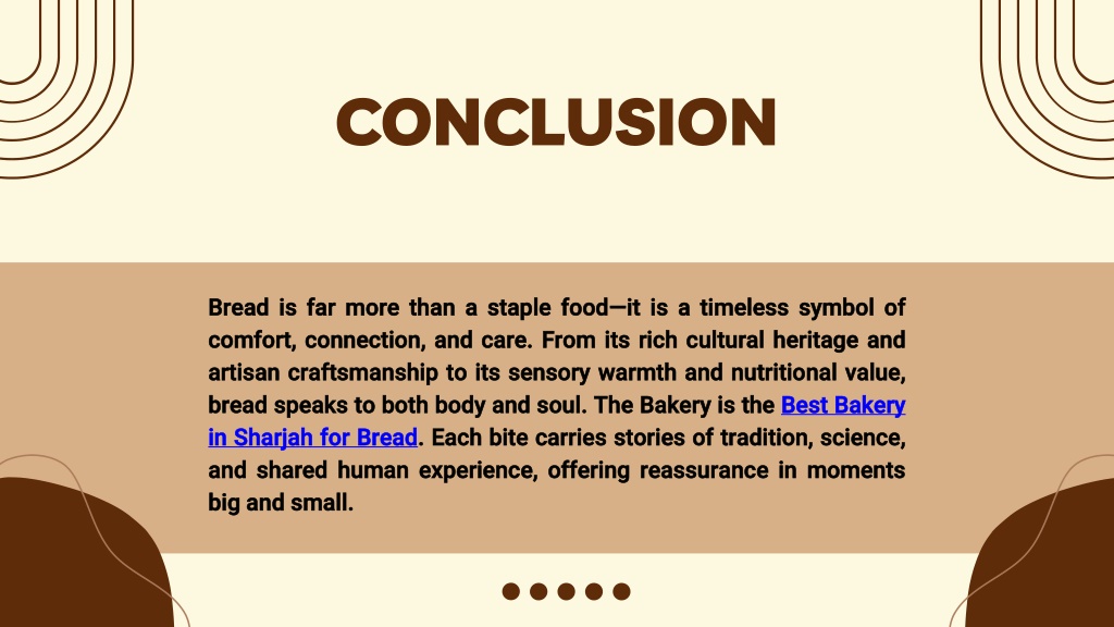 CONCLUSION Bread is far more than a staple food—it is a timeless symbol of comfort, connection, and care. From its rich cultural heritage and artisan craftsmanship to its sensory warmth and nutritional value, bread speaks to both body and soul. The Bakery is the Best Bakery in Sharjah for Bread. Each bite carries stories of tradition, science, and shared human experience, offering reassurance in moments big and small.