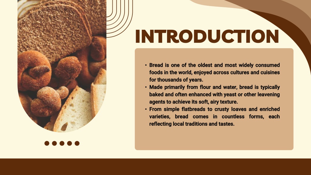 INTRODUCTION • Bread is one of the oldest and most widely consumed foods in the world, enjoyed across cultures and cuisines for thousands of years. • Made primarily from flour and water, bread is typically baked and often enhanced with yeast or other leavening agents to achieve its soft, airy texture. • From simple flatbreads to crusty loaves and enriched varieties, bread comes in countless forms, each reflecting local traditions and tastes.