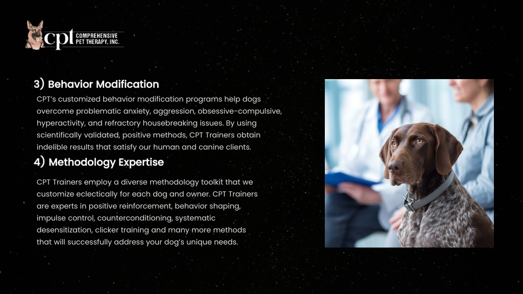 1) Experienced Trainers CPT has over 30 years of experience training over 50,000 dogs and hundreds of cats, using proven techniques that ensure effective and consistent obedience and behavioral outcomes. 2) Veterinary Recommendations Recommended by over 80 veterinary clinics, CPT’s education, knowledge, and accomplishments are well-respected within the pet professional community. CPT’s expertise produces reliable and trusted dog training and behavior modification solutions.
