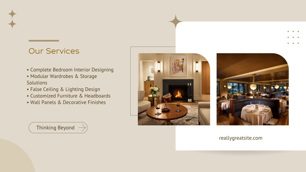 Our Services • Complete Bedroom Interior Designing • Modular Wardrobes & Storage Solutions • False Ceiling & Lighting Design • Customized Furniture & Headboards • Wall Panels & Decorative Finishes Thinking Beyond reallygreatsite.com