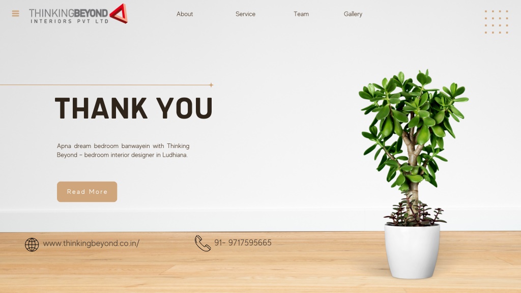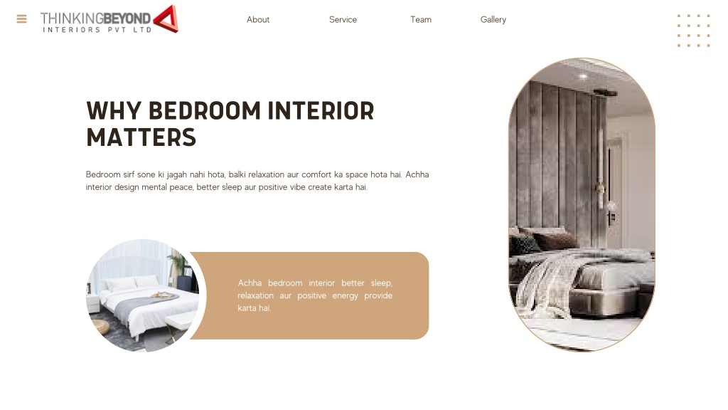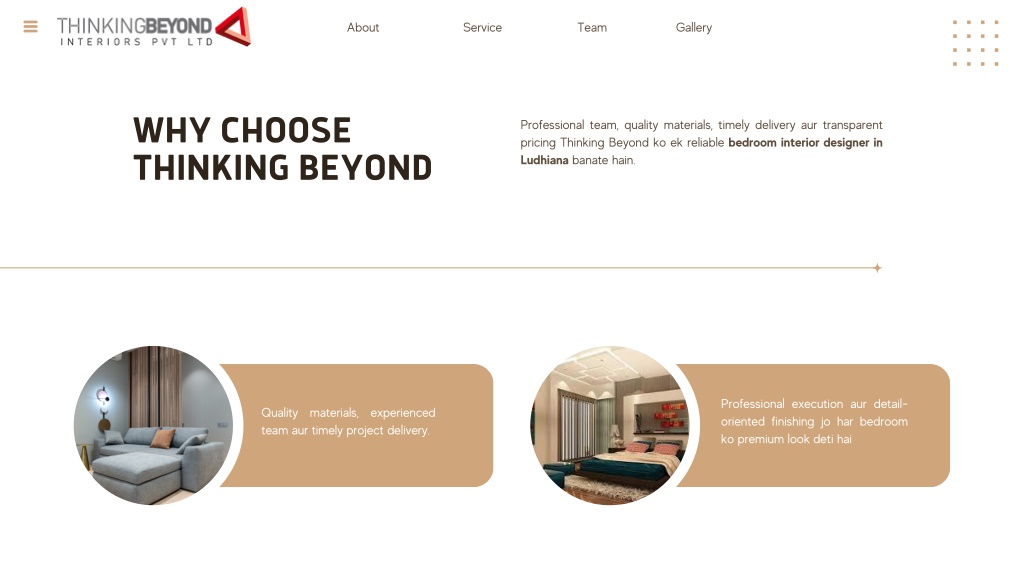 About Service Team Gallery WHY CHOOSE THINKING BEYOND Professional team, quality materials, timely delivery aur transparent pricing Thinking Beyond ko ek reliable bedroom interior designer in Ludhiana banate hain. Professional execution aur detail- oriented finishing jo har bedroom ko premium look deti hai Quality materials, experienced team aur timely project delivery.