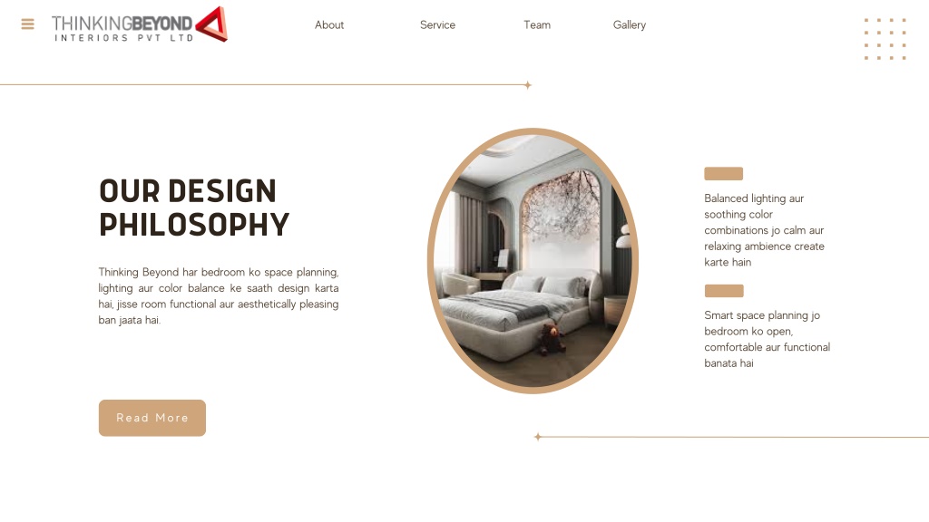 About Service Team Gallery OUR DESIGN PHILOSOPHY Balanced lighting aur soothing color combinations jo calm aur relaxing ambience create karte hain Thinking Beyond har bedroom ko space planning, lighting aur color balance ke saath design karta hai, jisse room functional aur aesthetically pleasing ban jaata hai. Smart space planning jo bedroom ko open, comfortable aur functional banata hai Read More