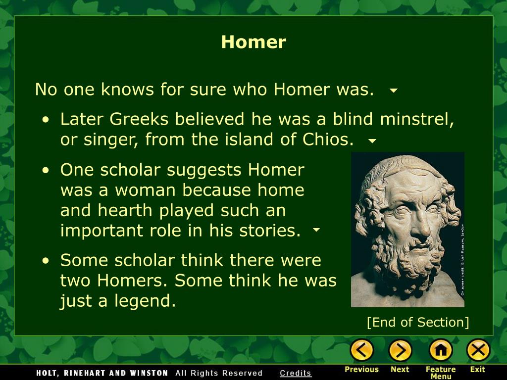 Homer No one knows for sure who Homer was. • Later Greeks believed he was a blind minstrel, or singer, from the island of Chios. • One scholar suggests Homer was a woman because home and hearth played such an important role in his stories. • Some scholar think there were two Homers. Some think he was just a legend. [End of Section]