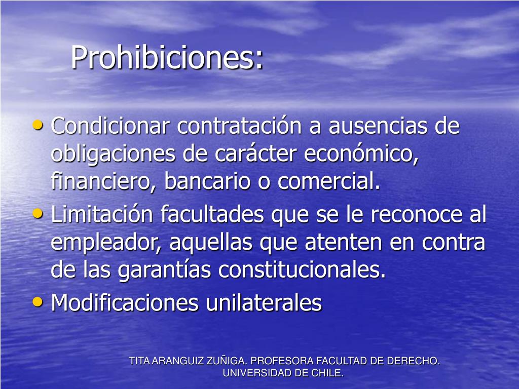 Prohibiciones: • Condicionar contratación a ausencias de obligaciones de carácter económico, financiero, bancario o comercial. • Limitación facultades que se le reconoce al empleador, aquellas que atenten en contra de las garantías constitucionales. • Modificaciones unilaterales TITA ARANGUIZ ZUÑIGA. PROFESORA FACULTAD DE DERECHO. UNIVERSIDAD DE CHILE.