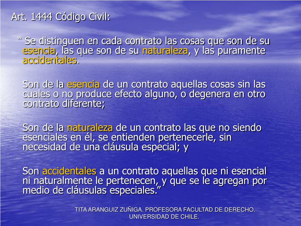 Art. 1444 Código Civil: “ Se distinguen en cada contrato las cosas que son de su esencia, las que son de su naturaleza, y las puramente accidentales. Son de la esencia de un contrato aquellas cosas sin las cuales o no produce efecto alguno, o degenera en otro contrato diferente; Son de la naturaleza de un contrato las que no siendo esenciales en él, se entienden pertenecerle, sin necesidad de una cláusula especial; y Son accidentales a un contrato aquellas que ni esencial ni naturalmente le pertenecen, y que se le agregan por medio de cláusulas especiales.” TITA ARANGUIZ ZUÑIGA. PROFESORA FACULTAD DE DERECHO. UNIVERSIDAD DE CHILE.