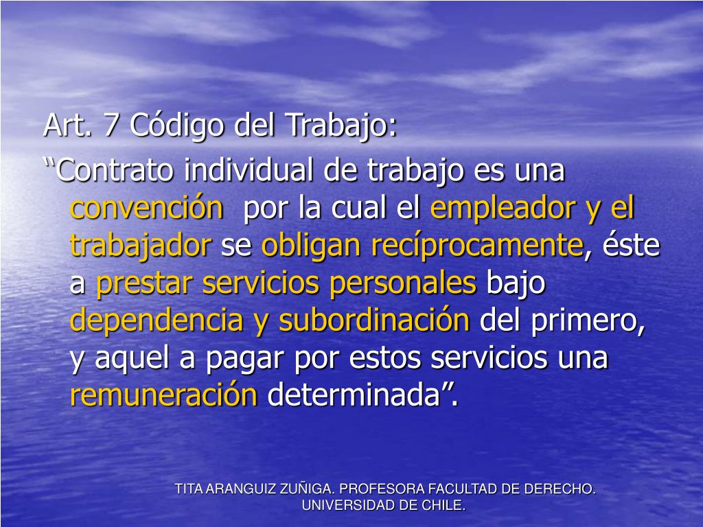 Art. 7 Código del Trabajo: “Contrato individual de trabajo es una convención por la cual el empleador y el trabajador se obligan recíprocamente, éste a prestar servicios personales bajo dependencia y subordinación del primero, y aquel a pagar por estos servicios una remuneración determinada”. TITA ARANGUIZ ZUÑIGA. PROFESORA FACULTAD DE DERECHO. UNIVERSIDAD DE CHILE.