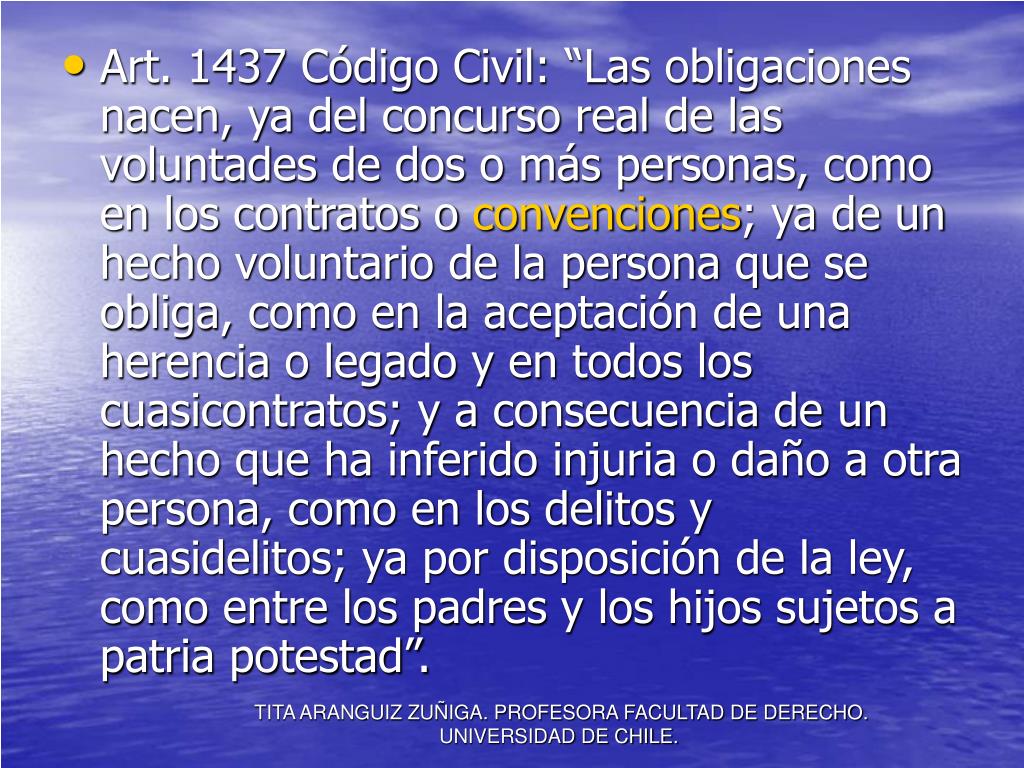 Art. 1437 Código Civil: “Las obligaciones nacen, ya del concurso real de las voluntades de dos o más personas, como en los contratos o convenciones; ya de un hecho voluntario de la persona que se obliga, como en la aceptación de una herencia o legado y en todos los cuasicontratos; y a consecuencia de un hecho que ha inferido injuria o daño a otra persona, como en los delitos y cuasidelitos; ya por disposición de la ley, como entre los padres y los hijos sujetos a patria potestad”. TITA ARANGUIZ ZUÑIGA. PROFESORA FACULTAD DE DERECHO. UNIVERSIDAD DE CHILE.