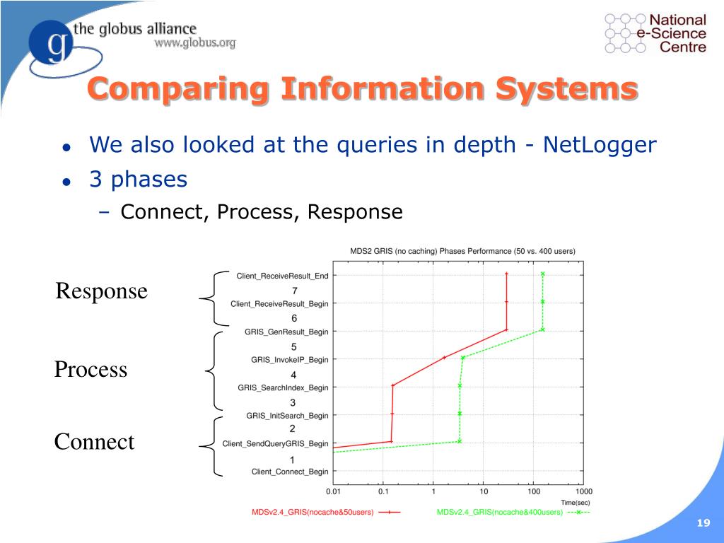 Comparing Information Systems • We also looked at the queries in depth - NetLogger • 3 phases • Connect, Process, Response Response Process Connect