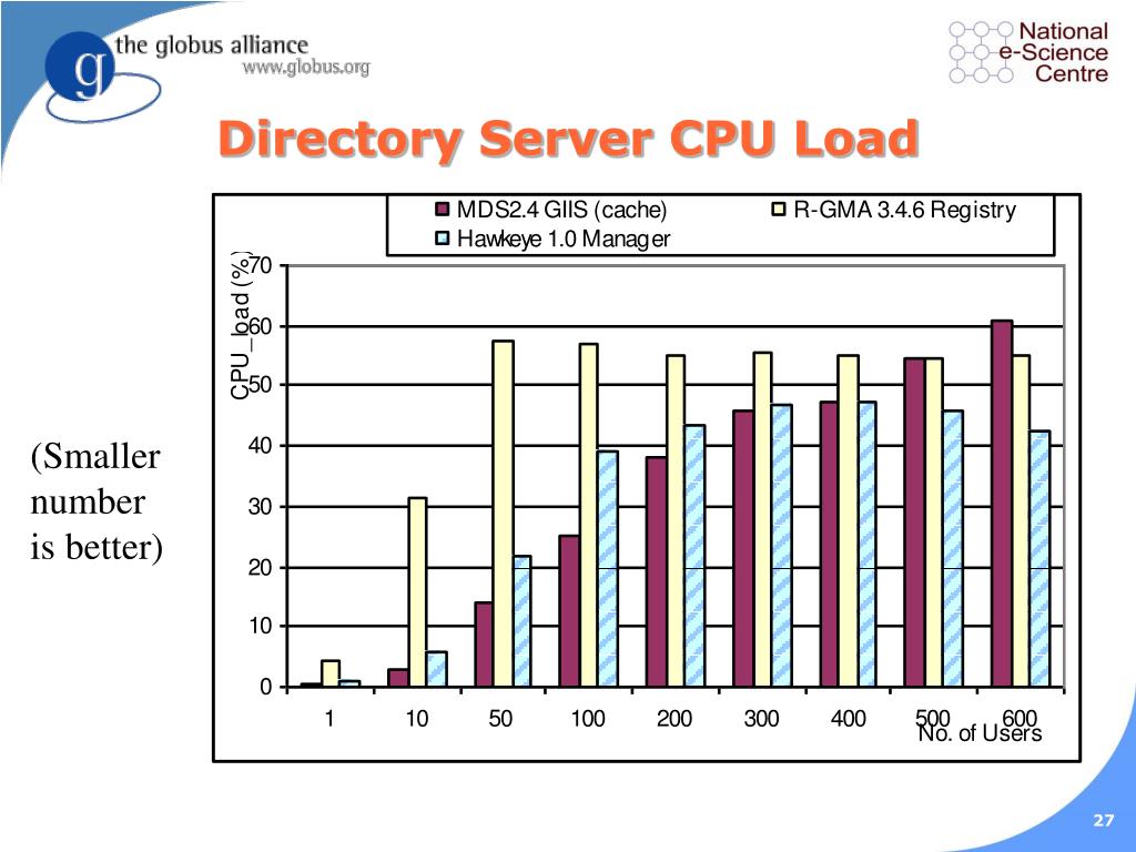 Experiments • How many users can query an information server at a time? • How many users can query a directory server? • How does an information server scale with the amount of data in it? • How does an aggregator scale with the number of information servers registered to it?