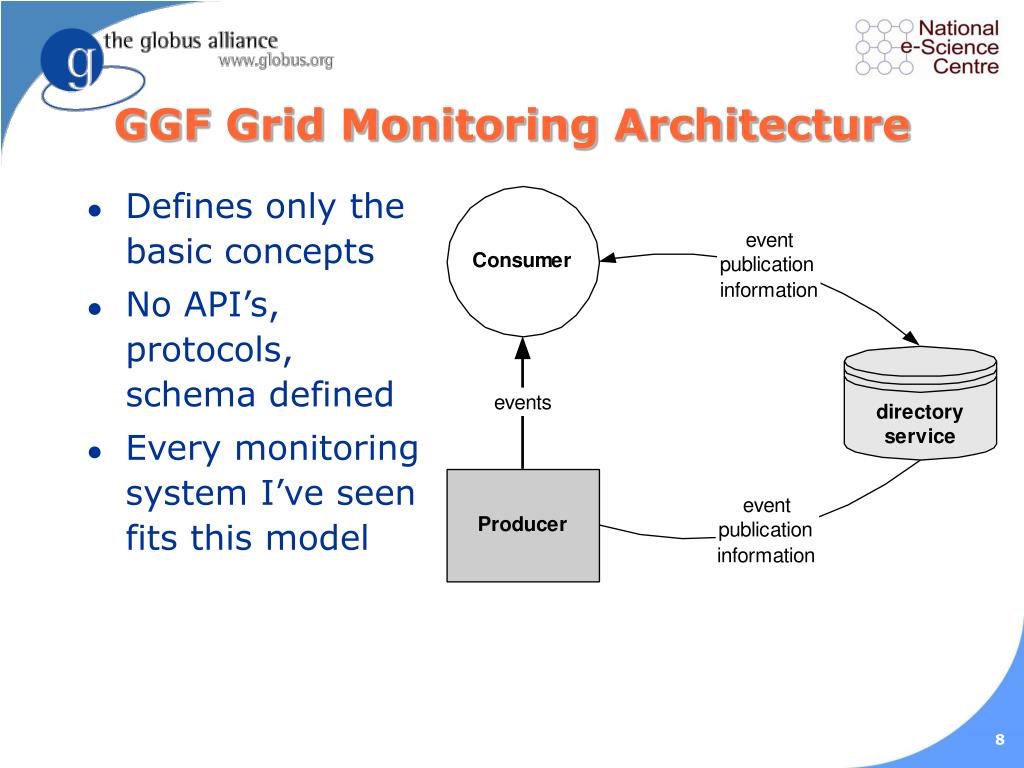 Defines only the basic concepts No API’s, protocols, schema defined Every monitoring system I’ve seen fits this model GGF Grid Monitoring Architecture