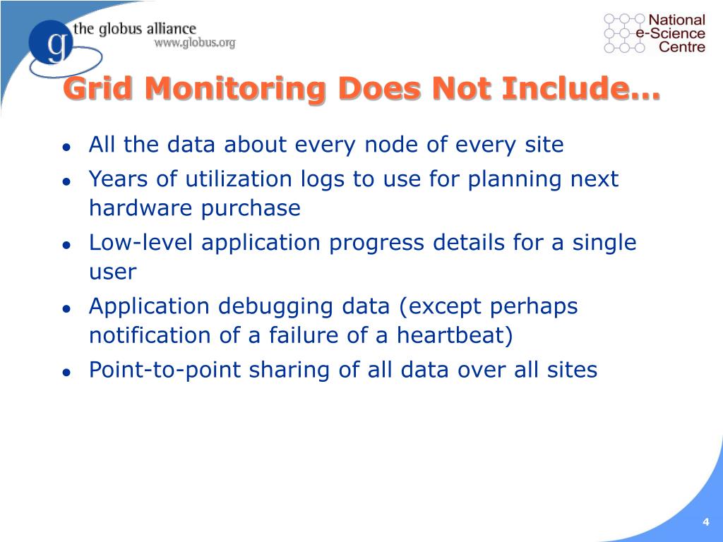 Grid Monitoring Does Not Include… • All the data about every node of every site • Years of utilization logs to use for planning next hardware purchase • Low-level application progress details for a single user • Application debugging data (except perhaps notification of a failure of a heartbeat) • Point-to-point sharing of all data over all sites