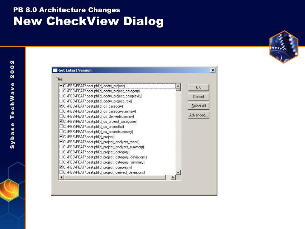 PB 8.0 Architecture ChangesAllow Target-Wide SCC Operations • PB 8.0 lets you perform an SCC operation for an entire target • Right Mouse Click on Target Icon • “Get Latest Version” to synchronize local target with SCC Provider • Choose “Select Multiple Files Contained Within this Target” • New CheckView dialog automatically selects objects that either do not exist locally or are out of synch • Three-pass compile/import resolves mutual dependencies