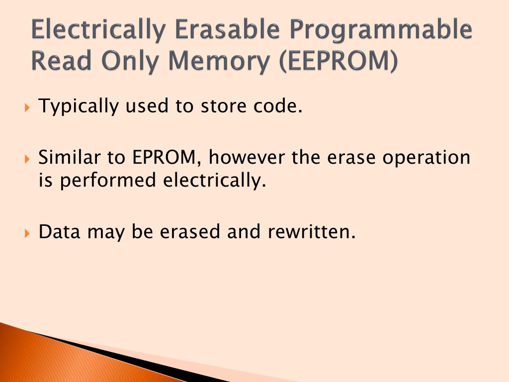 Electrically Erasable Programmable Read Only Memory (EEPROM) • Typically used to store code. • Similar to EPROM, however the erase operation is performed electrically. • Data may be erased and rewritten.