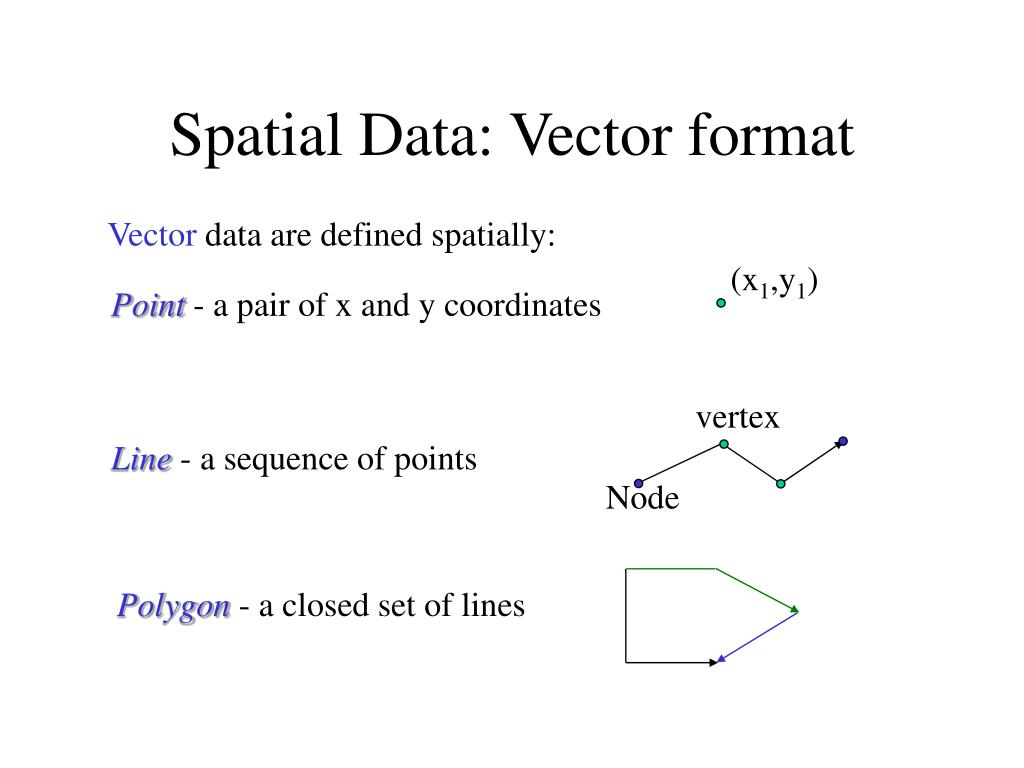 Spatial Data: Vector format Vector data are defined spatially: (x1,y1) Point - a pair of x and y coordinates vertex Line - a sequence of points Node Polygon - a closed set of lines