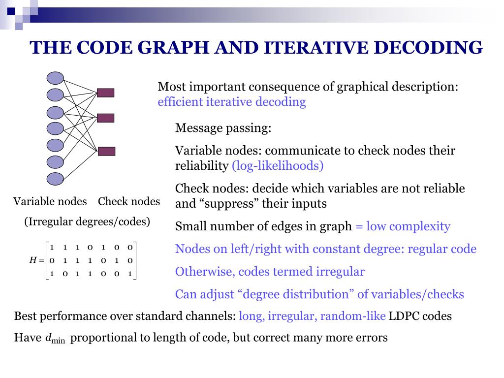 THE CODE GRAPH AND ITERATIVE DECODING Most important consequence of graphical description: efficient iterative decoding Message passing: Variable nodes: communicate to check nodes their reliability (log-likelihoods) Check nodes: decide which variables are not reliable and “suppress” their inputs Small number of edges in graph = low complexity Nodes on left/right with constant degree: regular code Otherwise, codes termed irregular Can adjust “degree distribution” of variables/checks Variable nodes Check nodes (Irregular degrees/codes) Best performance over standard channels: long, irregular, random-like LDPC codes Have proportional to length of code, but correct many more errors
