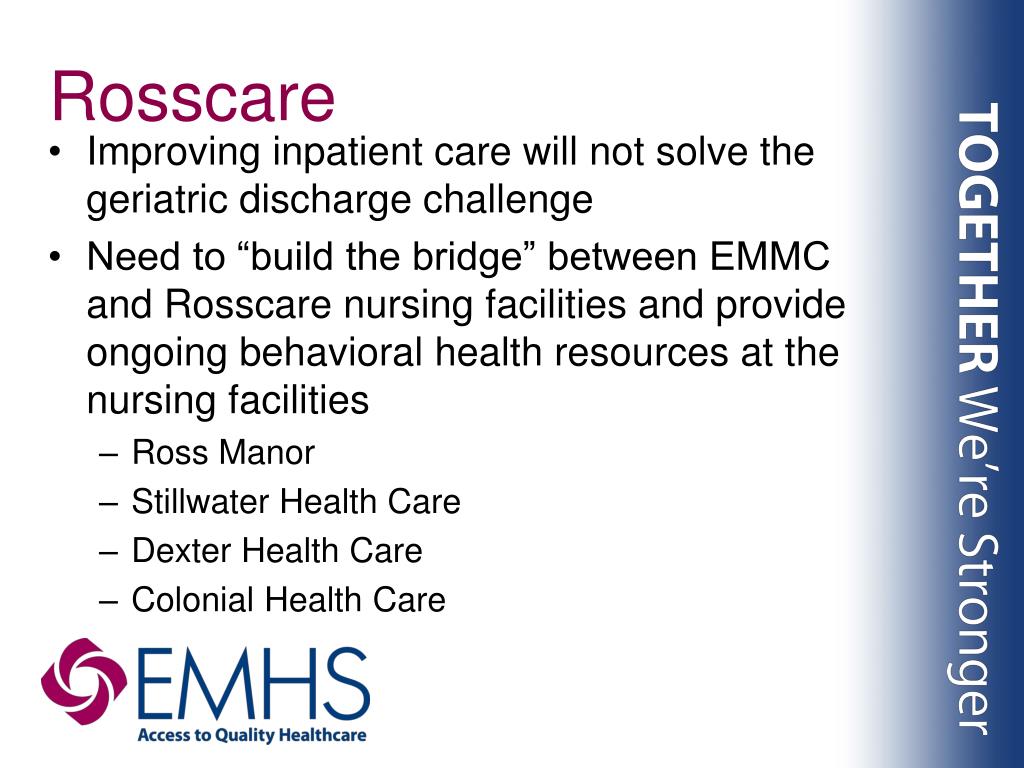 Rosscare • Improving inpatient care will not solve the geriatric discharge challenge • Need to “build the bridge” between EMMC and Rosscare nursing facilities and provide ongoing behavioral health resources at the nursing facilities • Ross Manor • Stillwater Health Care • Dexter Health Care • Colonial Health Care