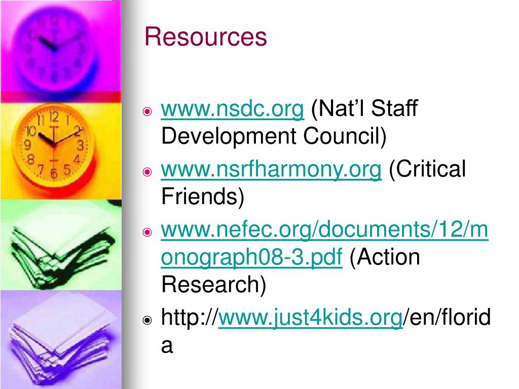 Resources • www.nsdc.org (Nat’l Staff Development Council) • www.nsrfharmony.org (Critical Friends) • www.nefec.org/documents/12/monograph08-3.pdf (Action Research) • http://www.just4kids.org/en/florida