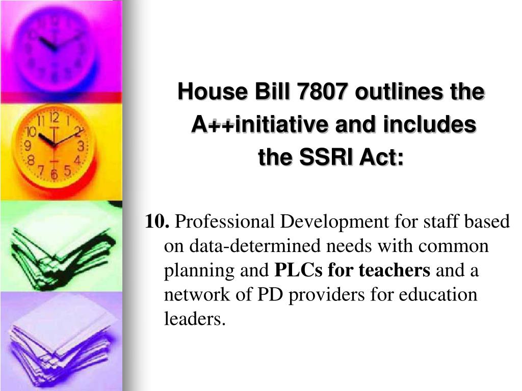 House Bill 7807 outlines the A++initiative and includes the SSRI Act: 10. Professional Development for staff based on data-determined needs with common planning and PLCs for teachers and a network of PD providers for education leaders.