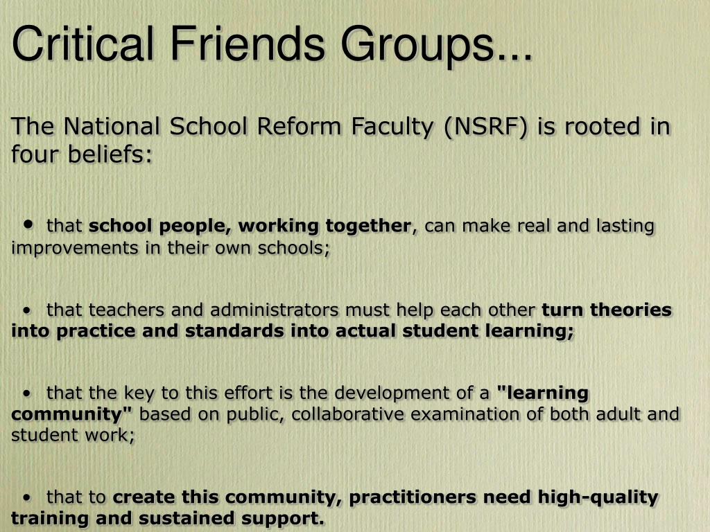 Critical Friends Groups... The National School Reform Faculty (NSRF) is rooted in four beliefs: • that school people, working together, can make real and lasting improvements in their own schools; • that teachers and administrators must help each other turn theories into practice and standards into actual student learning; • that the key to this effort is the development of a "learning community" based on public, collaborative examination of both adult and student work; • that to create this community, practitioners need high-quality training and sustained support.