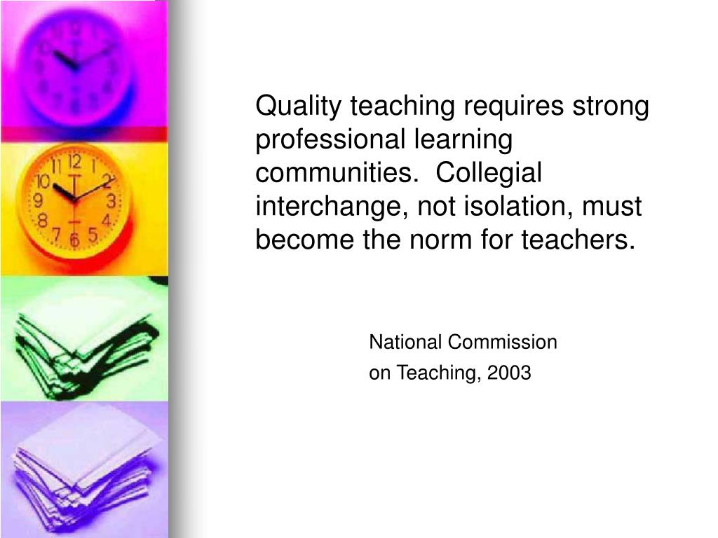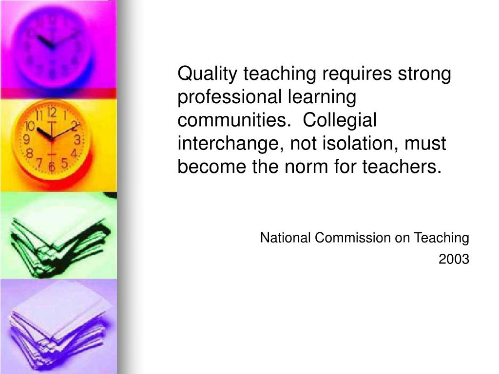 Quality teaching requires strong professional learning communities. Collegial interchange, not isolation, must become the norm for teachers. National Commission on Teaching, 2003