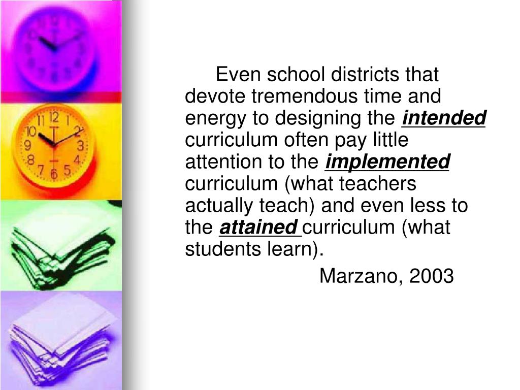 Even school districts that devote tremendous time and energy to designing the intendedcurriculum often pay little attention to the implemented curriculum (what teachers actually teach) and even less to the attained curriculum (what students learn). Marzano, 2003