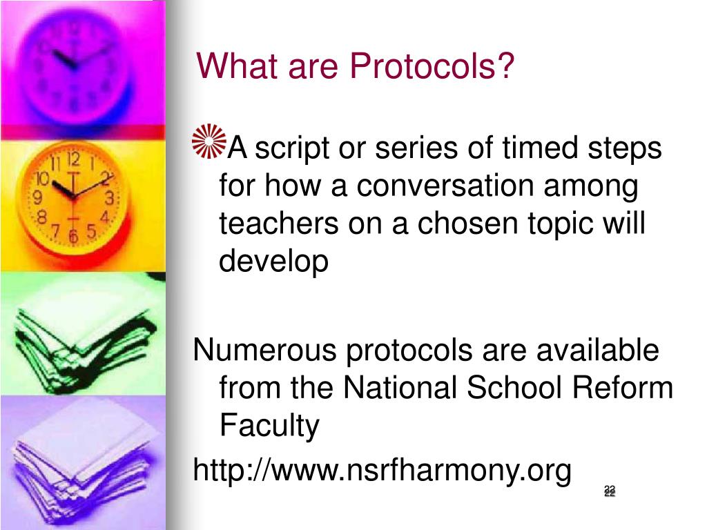 What are Protocols? • A script or series of timed steps for how a conversation among teachers on a chosen topic will develop Numerous protocols are available from the National School Reform Faculty http://www.nsrfharmony.org 22