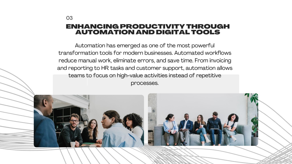 03 ENHANCING PRODUCTIVITY THROUGH AUTOMATION AND DIGITAL TOOLS Automation has emerged as one of the most powerful transformation tools for modern businesses. Automated workflows reduce manual work, eliminate errors, and save time. From invoicing and reporting to HR tasks and customer support, automation allows teams to focus on high-value activities instead of repetitive processes.