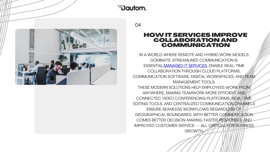 04 HOW IT SERVICES IMPROVE COLLABORATION AND COMMUNICATION IN A WORLD WHERE REMOTE AND HYBRID WORK MODELS DOMINATE, STREAMLINED COMMUNICATION IS ESSENTIAL.MANAGED IT SERVICES ENABLE REAL-TIME COLLABORATION THROUGH CLOUD PLATFORMS, COMMUNICATION SOFTWARE, DIGITAL WORKSPACES, AND TEAM MANAGEMENT TOOLS. THESE MODERN SOLUTIONS HELP EMPLOYEES WORK FROM ANYWHERE, MAKING TEAMWORK MORE EFFICIENT AND CONNECTED. VIDEO CONFERENCING PLATFORMS, REAL-TIME EDITING TOOLS, AND CENTRALIZED COMMUNICATION CHANNELS ENSURE SEAMLESS WORKFLOWS REGARDLESS OF GEOGRAPHICAL BOUNDARIES. WITH BETTER COMMUNICATION COMES BETTER DECISION-MAKING, FASTER RESPONSES, AND IMPROVED CUSTOMER SERVICE — ALL CRITICAL FOR BUSINESS GROWTH.