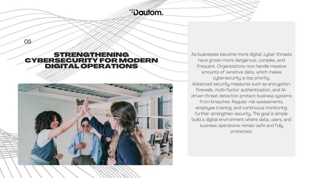 05 As businesses become more digital, cyber threats have grown more dangerous, complex, and frequent. Organizations now handle massive amounts of sensitive data, which makes cybersecurity a top priority. Advanced security measures such as encryption, firewalls, multi-factor authentication, and AI-driven threat detection protect business systems from breaches. Regular risk assessments, employee training, and continuous monitoring further strengthen security. The goal is simple: build a digital environment where data, users, and business operations remain safe and fully protected. STRENGTHENING CYBERSECURITY FOR MODERN DIGITAL OPERATIONS