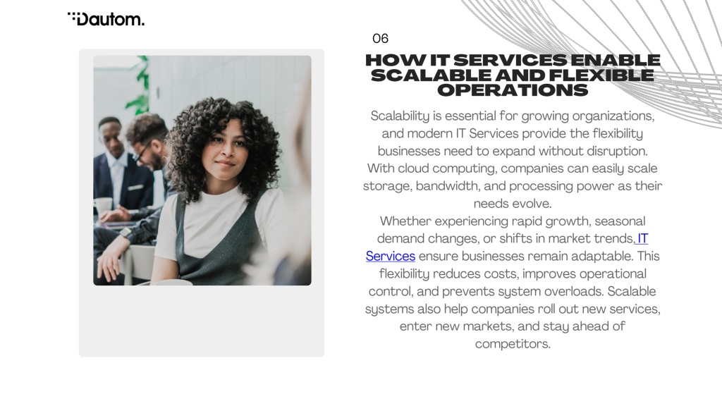 06 HOW IT SERVICES ENABLE SCALABLE AND FLEXIBLE OPERATIONS Scalability is essential for growing organizations, and modern IT Services provide the flexibility businesses need to expand without disruption. With cloud computing, companies can easily scale storage, bandwidth, and processing power as their needs evolve. Whether experiencing rapid growth, seasonal demand changes, or shifts in market trends, IT Services ensure businesses remain adaptable. This flexibility reduces costs, improves operational control, and prevents system overloads. Scalable systems also help companies roll out new services, enter new markets, and stay ahead of competitors.