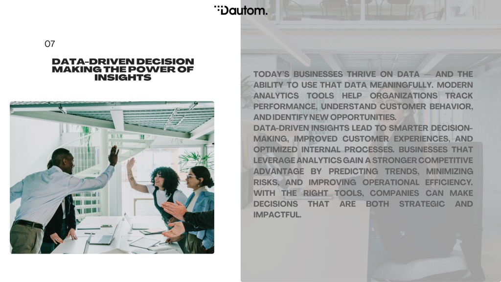 07 DATA-DRIVEN DECISION MAKING THE POWER OF INSIGHTS TODAY’S BUSINESSES THRIVE ON DATA — AND THE ABILITY TO USE THAT DATA MEANINGFULLY. MODERN ANALYTICS TOOLS HELP ORGANIZATIONS TRACK PERFORMANCE, UNDERSTAND CUSTOMER BEHAVIOR, AND IDENTIFY NEW OPPORTUNITIES. DATA-DRIVEN INSIGHTS LEAD TO SMARTER DECISION-MAKING, IMPROVED CUSTOMER EXPERIENCES, AND OPTIMIZED INTERNAL PROCESSES. BUSINESSES THAT LEVERAGE ANALYTICS GAIN A STRONGER COMPETITIVE ADVANTAGE BY PREDICTING TRENDS, MINIMIZING RISKS, AND IMPROVING OPERATIONAL EFFICIENCY. WITH THE RIGHT TOOLS, COMPANIES CAN MAKE DECISIONS THAT ARE BOTH STRATEGIC AND IMPACTFUL.
