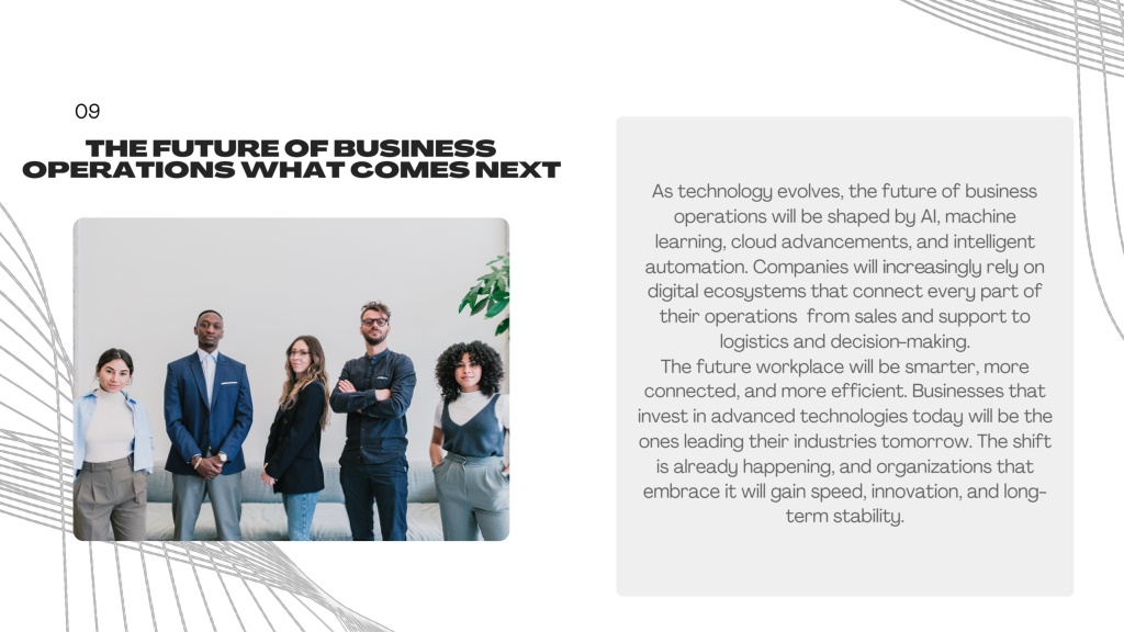 09 THE FUTURE OF BUSINESS OPERATIONS WHAT COMES NEXT As technology evolves, the future of business operations will be shaped by AI, machine learning, cloud advancements, and intelligent automation. Companies will increasingly rely on digital ecosystems that connect every part of their operations from sales and support to logistics and decision-making. The future workplace will be smarter, more connected, and more efficient. Businesses that invest in advanced technologies today will be the ones leading their industries tomorrow. The shift is already happening, and organizations that embrace it will gain speed, innovation, and long-term stability.