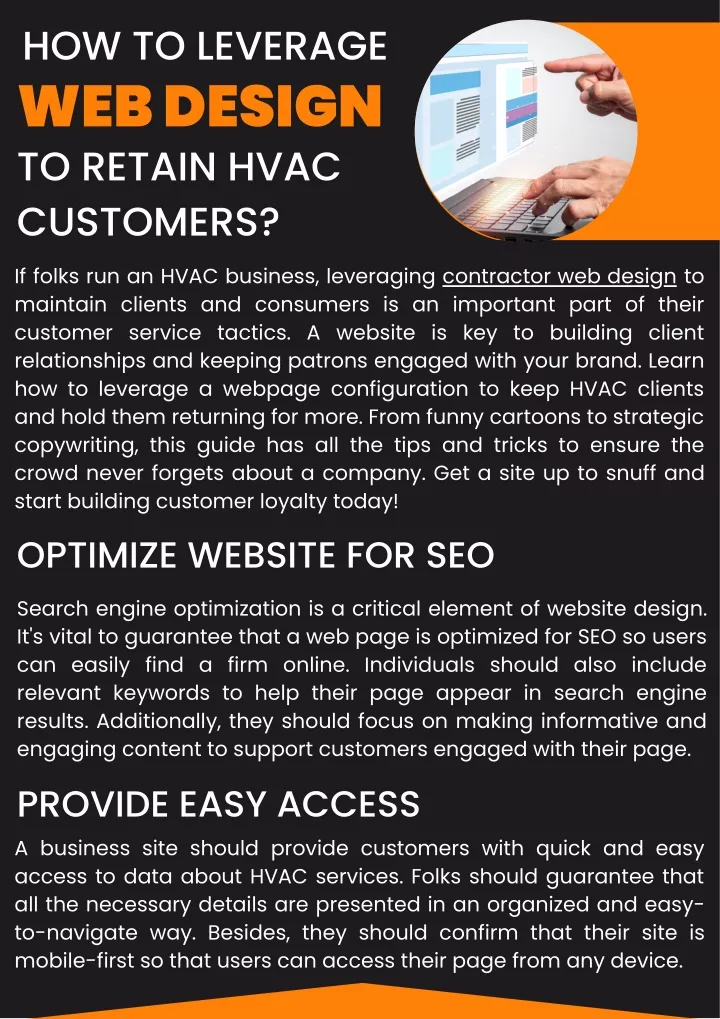 HOW TO LEVERAGE WEB DESIGN TO RETAIN HVAC CUSTOMERS? If folks run an HVAC business, leveraging contractor web design to maintain clients and consumers is an important part of their customer service tactics. A website is key to building client relationships and keeping patrons engaged with your brand. Learn how to leverage a webpage configuration to keep HVAC clients and hold them returning for more. From funny cartoons to strategic copywriting, this guide has all the tips and tricks to ensure the crowd never forgets about a company. Get a site up to snuff and start building customer loyalty today! OPTIMIZE WEBSITE FOR SEO Search engine optimization is a critical element of website design. It's vital to guarantee that a web page is optimized for SEO so users can easily find a firm online. Individuals should also include relevant keywords to help their page appear in search engine results. Additionally, they should focus on making informative and engaging content to support customers engaged with their page. PROVIDE EASY ACCESS A business site should provide customers with quick and easy access to data about HVAC services. Folks should guarantee that all the necessary details are presented in an organized and easy- to-navigate way. Besides, they should confirm that their site is mobile-first so that users can access their page from any device.