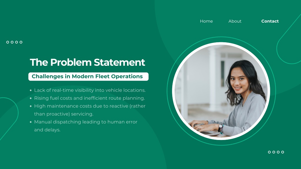2. Home About Contact The Problem Statement Challenges in Modern Fleet Operations Lack of real-time visibility into vehicle locations. Rising fuel costs and inefficient route planning. High maintenance costs due to reactive (rather than proactive) servicing. Manual dispatching leading to human error and delays.