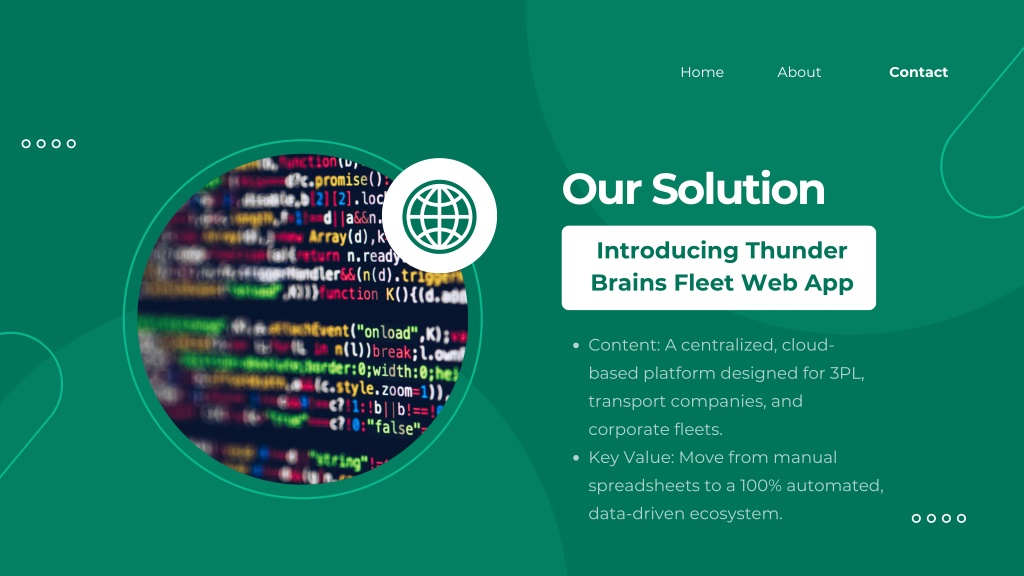 3. Home About Contact Our Solution Introducing Thunder Brains Fleet Web App Content: A centralized, cloud- based platform designed for 3PL, transport companies, and corporate fleets. Key Value: Move from manual spreadsheets to a 100% automated, data-driven ecosystem.