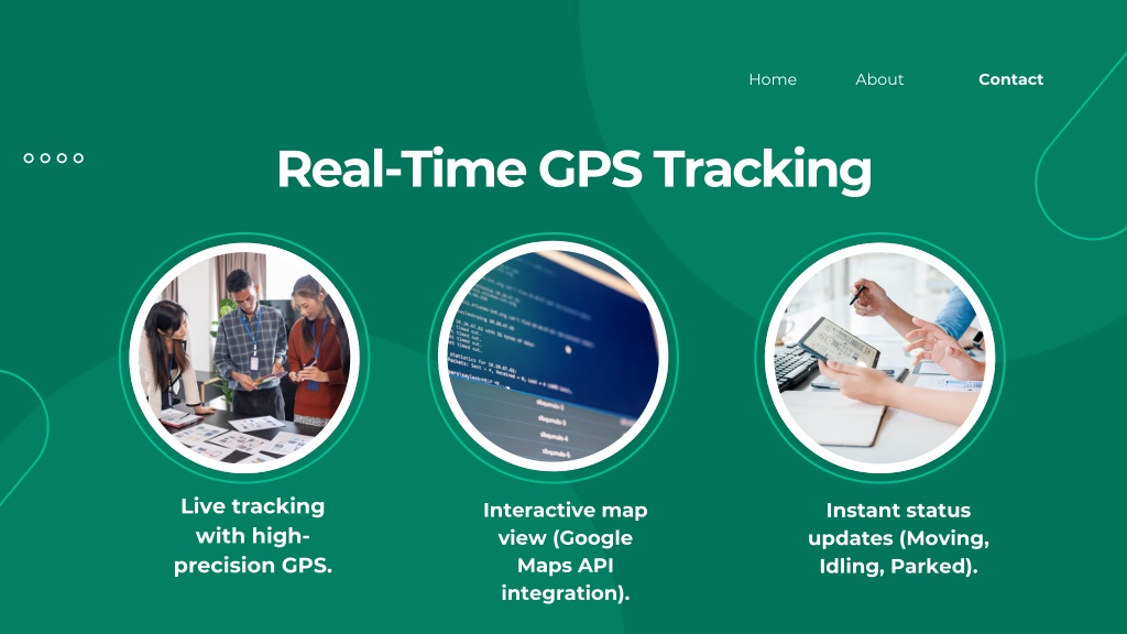 4. Home About Contact Real-Time GPS Tracking Live tracking with high- precision GPS. Instant status updates (Moving, Idling, Parked). Interactive map view (Google Maps API integration).