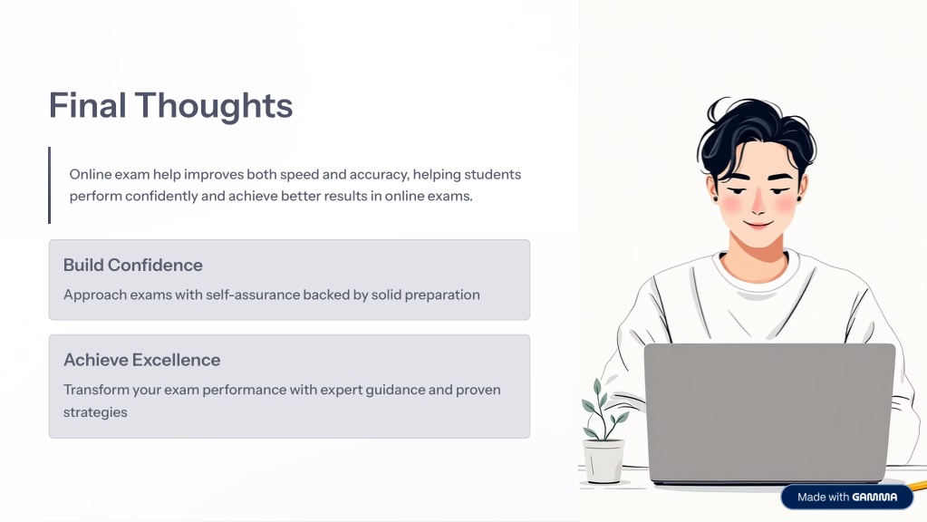 9. Final Thoughts Online exam help improves both speed and accuracy, helping students perform confidently and achieve better results in online exams. Build Confidence Approach exams with self-assurance backed by solid preparation Achieve Excellence Transform your exam performance with expert guidance and proven strategies