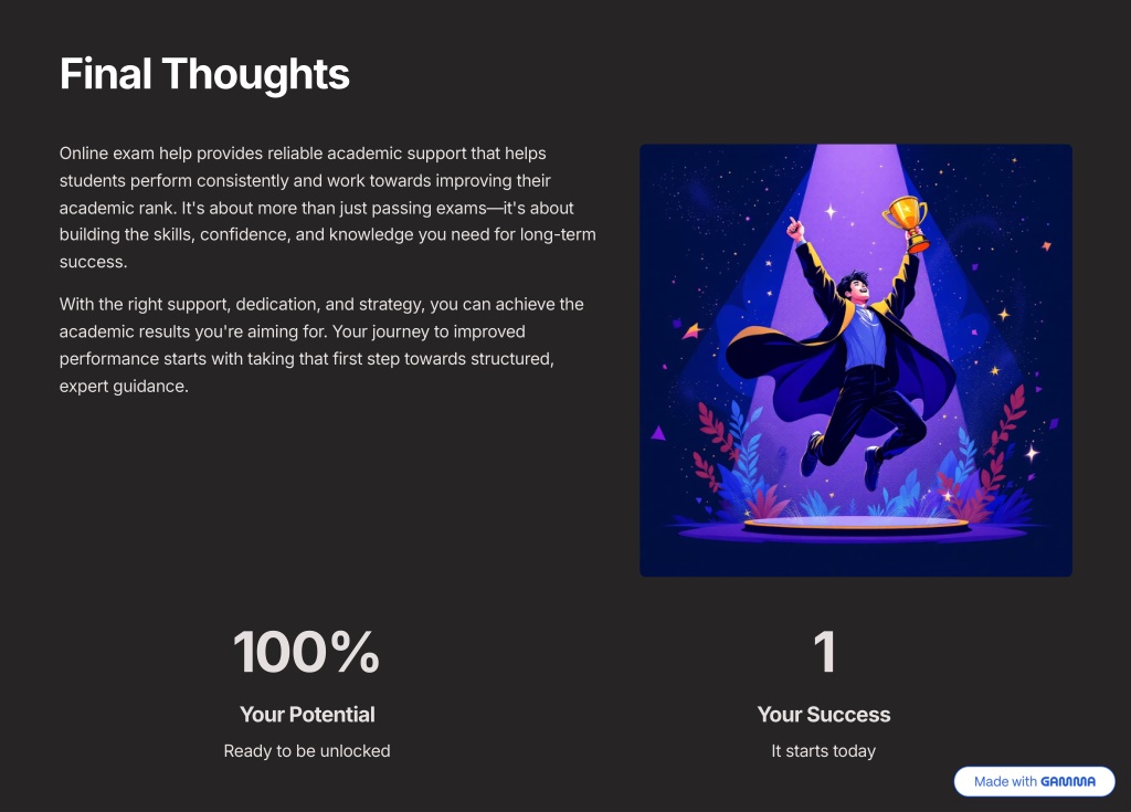 9. Final Thoughts Online exam help provides reliable academic support that helps students perform consistently and work towards improving their academic rank. It's about more than just passing exams—it's about building the skills, confidence, and knowledge you need for long-term success. With the right support, dedication, and strategy, you can achieve the academic results you're aiming for. Your journey to improved performance starts with taking that first step towards structured, expert guidance. 100% 1 Your Potential Your Success Ready to be unlocked It starts today