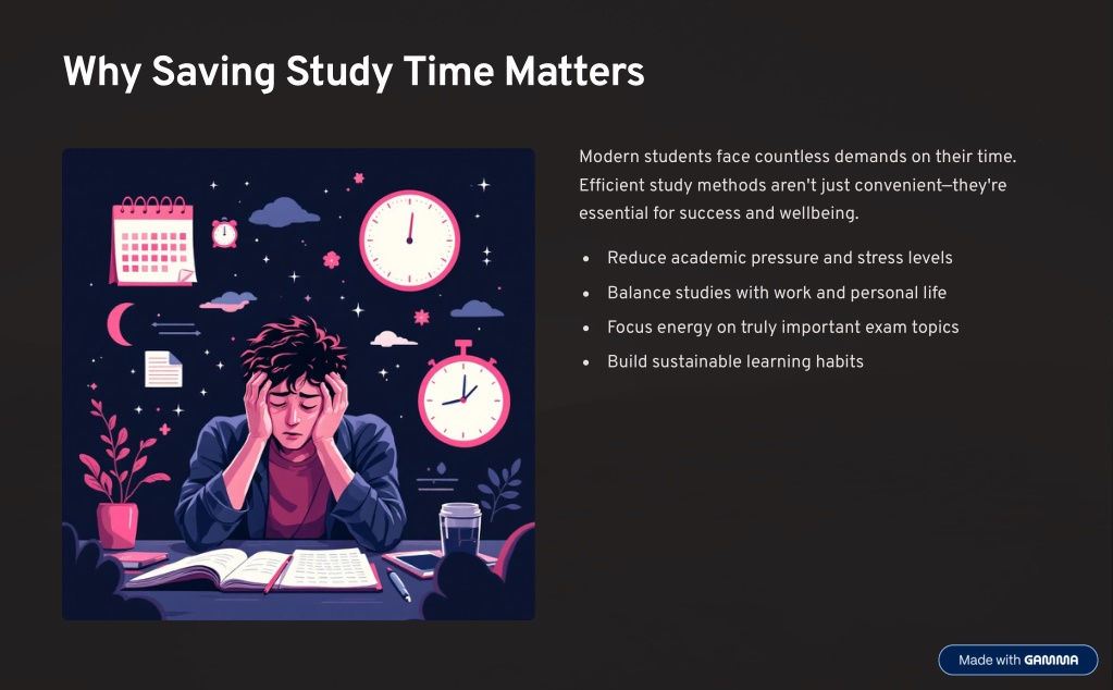 2. Why Saving Study Time Matters Modern students face countless demands on their time. Efficient study methods aren't just convenient4they're essential for success and wellbeing. Reduce academic pressure and stress levels Balance studies with work and personal life Focus energy on truly important exam topics Build sustainable learning habits