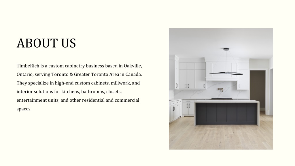 ABOUT US TimbeRich is a custom cabinetry business based in Oakville, Ontario, serving Toronto & Greater Toronto Area in Canada. They specialize in high-end custom cabinets, millwork, and interior solutions for kitchens, bathrooms, closets, entertainment units, and other residential and commercial spaces.