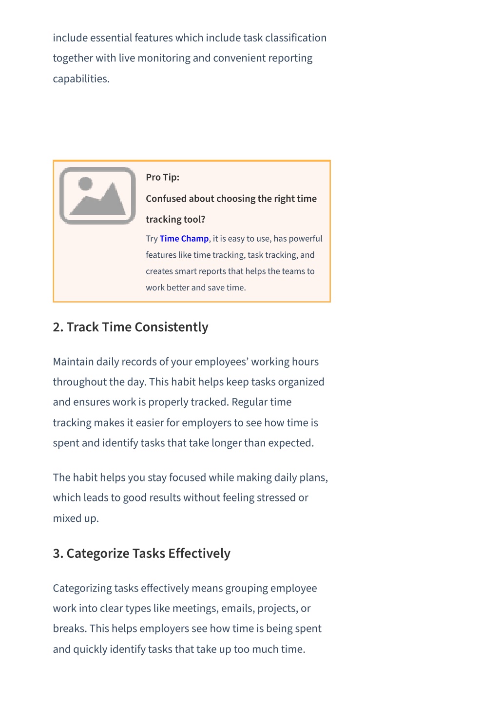 3. include essential features which include task classification together with live monitoring and convenient reporting capabilities. Pro Tip: Confused about choosing the right time tracking tool? Try Time Champ, it is easy to use, has powerful features like time tracking, task tracking, and creates smart reports that helps the teams to work better and save time. 2. Track Time Consistently Maintain daily records of your employeesʼ working hours throughout the day. This habit helps keep tasks organized and ensures work is properly tracked. Regular time tracking makes it easier for employers to see how time is spent and identify tasks that take longer than expected. The habit helps you stay focused while making daily plans, which leads to good results without feeling stressed or mixed up. 3. Categorize Tasks Effectively Categorizing tasks e?ectively means grouping employee work into clear types like meetings, emails, projects, or breaks. This helps employers see how time is being spent and quickly identify tasks that take up too much time.
