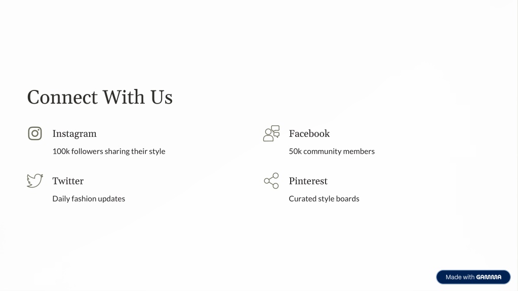 Connect With Us Instagram Facebook 100k followers sharing their style 50k community members Twitter Pinterest Daily fashion updates Curated style boards
