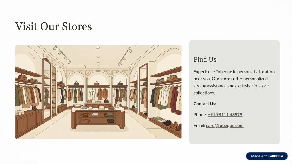 Visit Our Stores Find Us Experience Tobeque in person at a location near you. Our stores offer personalized styling assistance and exclusive in-store collections. Contact Us: Phone: +91 98111 43979 Email: care@tobeque.com
