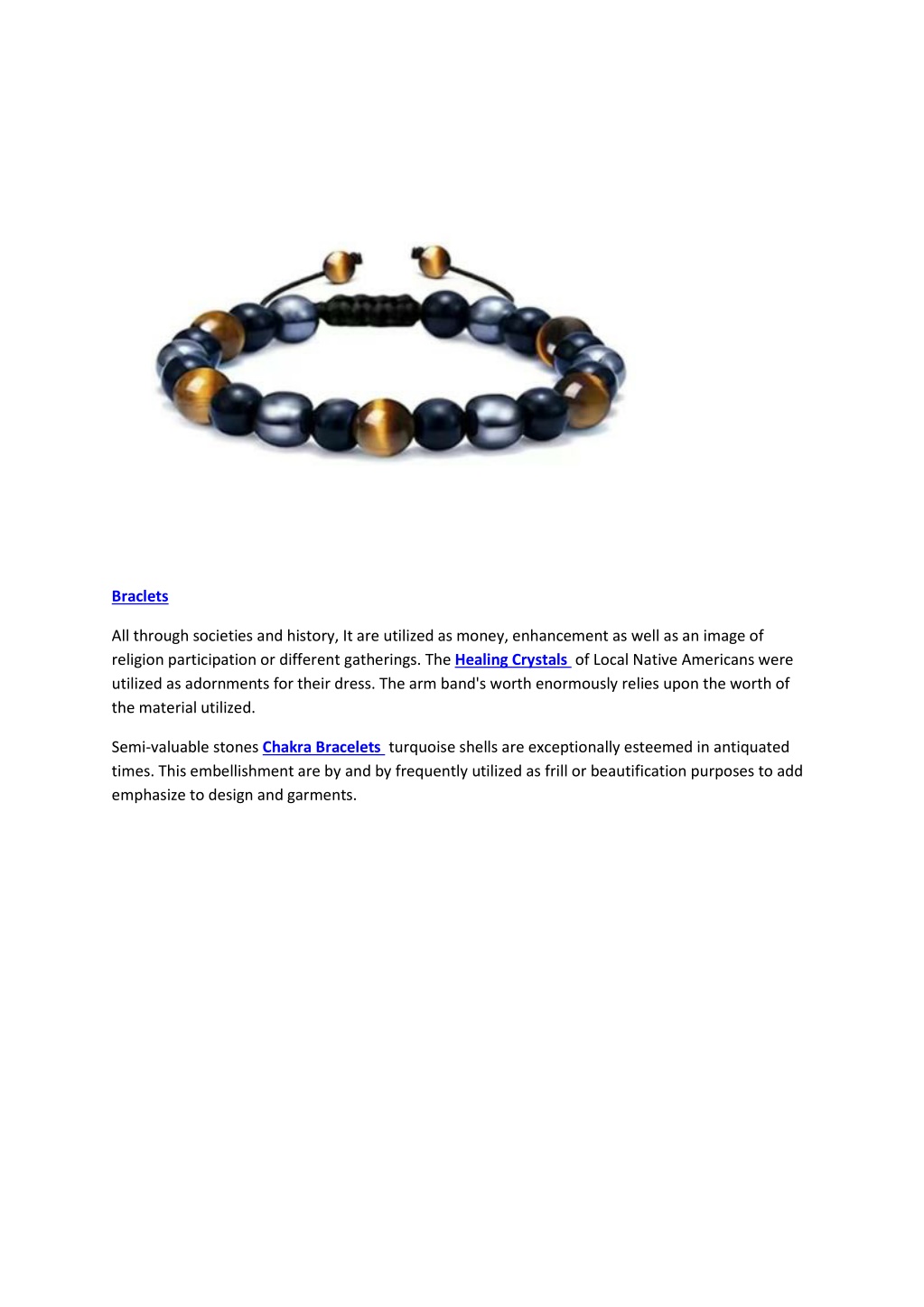 Braclets All through societies and history, It are utilized as money, enhancement as well as an image of religion participation or different gatherings. The Healing Crystals of Local Native Americans were utilized as adornments for their dress. The arm band's worth enormously relies upon the worth of the material utilized. Semi-valuable stones Chakra Bracelets turquoise shells are exceptionally esteemed in antiquated times. This embellishment are by and by frequently utilized as frill or beautification purposes to add emphasize to design and garments.