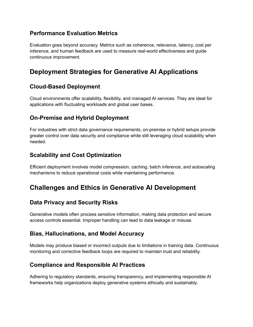 Performance Evaluation Metrics Evaluation goes beyond accuracy. Metrics such as coherence, relevance, latency, cost per inference, and human feedback are used to measure real-world effectiveness and guide continuous improvement. Deployment Strategies for Generative AI Applications Cloud-Based Deployment Cloud environments offer scalability, flexibility, and managed AI services. They are ideal for applications with fluctuating workloads and global user bases. On-Premise and Hybrid Deployment For industries with strict data governance requirements, on-premise or hybrid setups provide greater control over data security and compliance while still leveraging cloud scalability when needed. Scalability and Cost Optimization Efficient deployment involves model compression, caching, batch inference, and autoscaling mechanisms to reduce operational costs while maintaining performance. Challenges and Ethics in Generative AI Development Data Privacy and Security Risks Generative models often process sensitive information, making data protection and secure access controls essential. Improper handling can lead to data leakage or misuse. Bias, Hallucinations, and Model Accuracy Models may produce biased or incorrect outputs due to limitations in training data. Continuous monitoring and corrective feedback loops are required to maintain trust and reliability. Compliance and Responsible AI Practices Adhering to regulatory standards, ensuring transparency, and implementing responsible AI frameworks help organizations deploy generative systems ethically and sustainably.