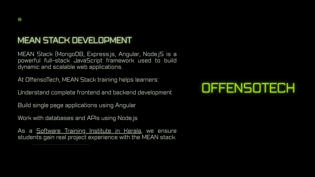 MEAN Stack (MongoDB, Express.js, Angular, Node.jS is a powerful full-stack JavaScript framework used to build dynamic and scalable web applications. At OffensoTech, MEAN Stack training helps learners: Understand complete frontend and backend development Build single page applications using Angular Work with databases and APIs using Node.js As a Software Training Institute in Kerala, we ensure students gain real project experience with the MEAN stack.